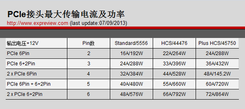 故PCIE 6Pin接口只有2组接线用于传输电流,PCIE 8Pin接口为3组,按照使用的端子的级别不同,可以传输的功率也不同。其中单6Pin、8Pin、双6Pin、6Pin+8Pin、双8Pin可以提供的功率如下: