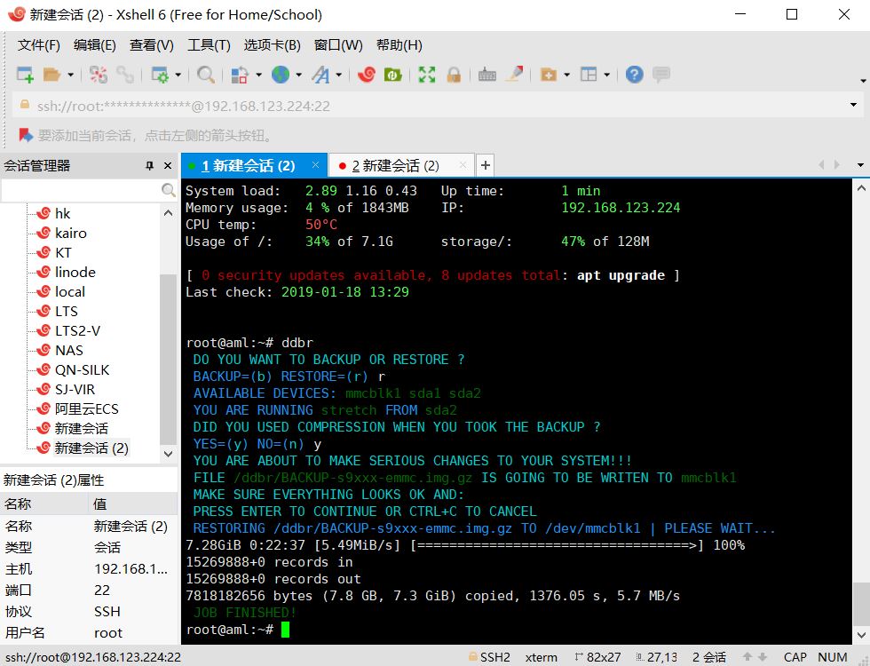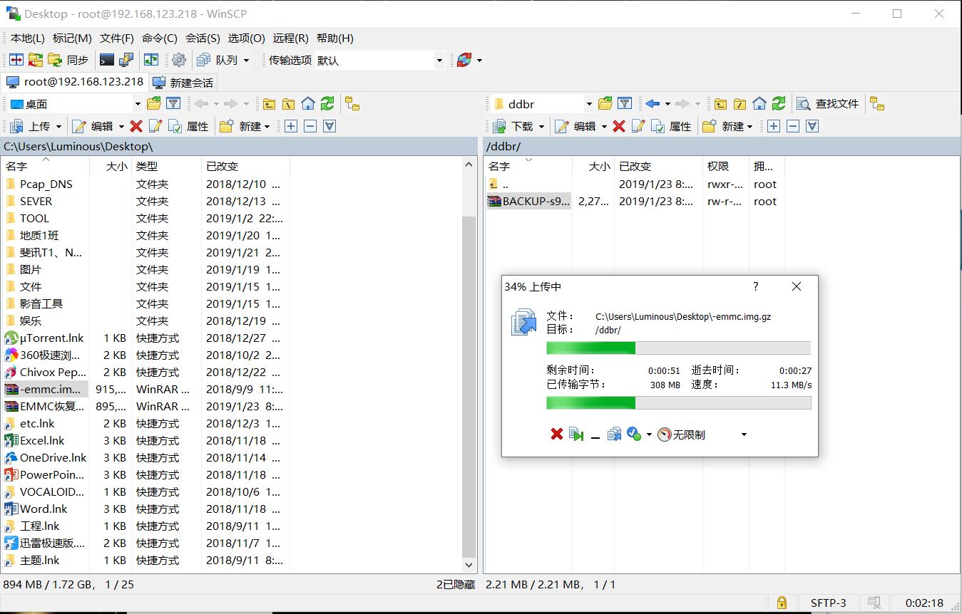 打开winscp用sftp加你的ssh登录信息登陆,进入/ddbr目录,可以看到一个*-emmc.img.gz文件,将它的文件名复制下来然后删除该文件。把从网盘下载的原版系统ddbr包上传到该目录,上传完成后把文件名改成刚才复制的文件名。