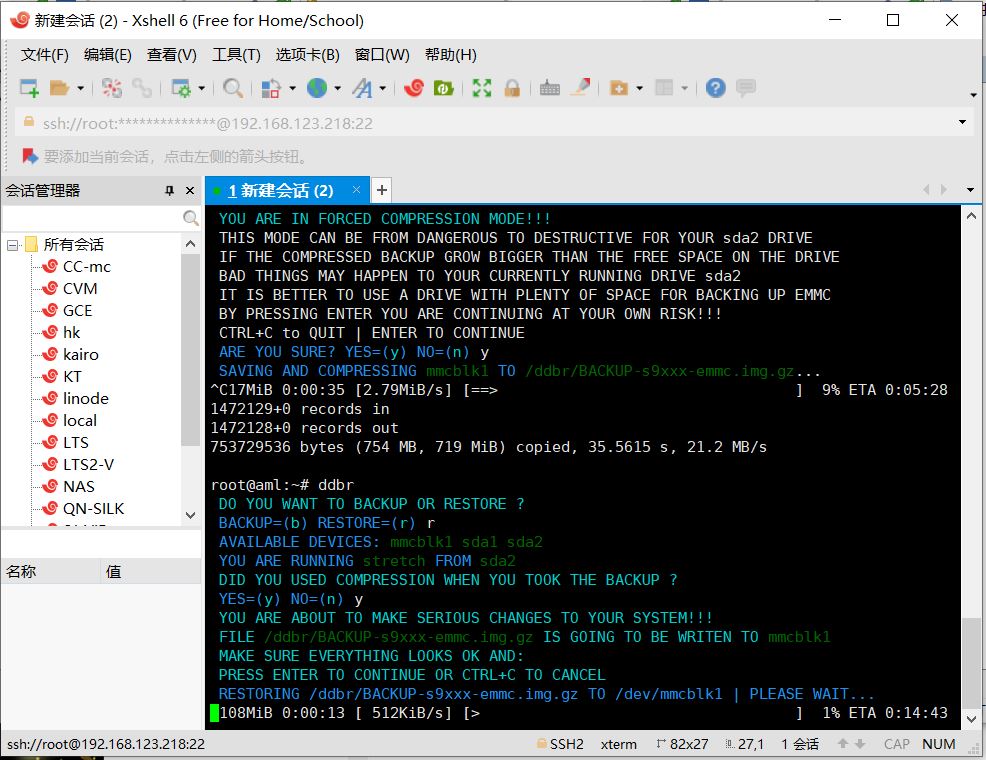 然后回到Xshell,输入ddbr指令,这回键入r(restore),它会询问你是否使用了压缩(DID YOU USED COMPRESSION),选择y即可